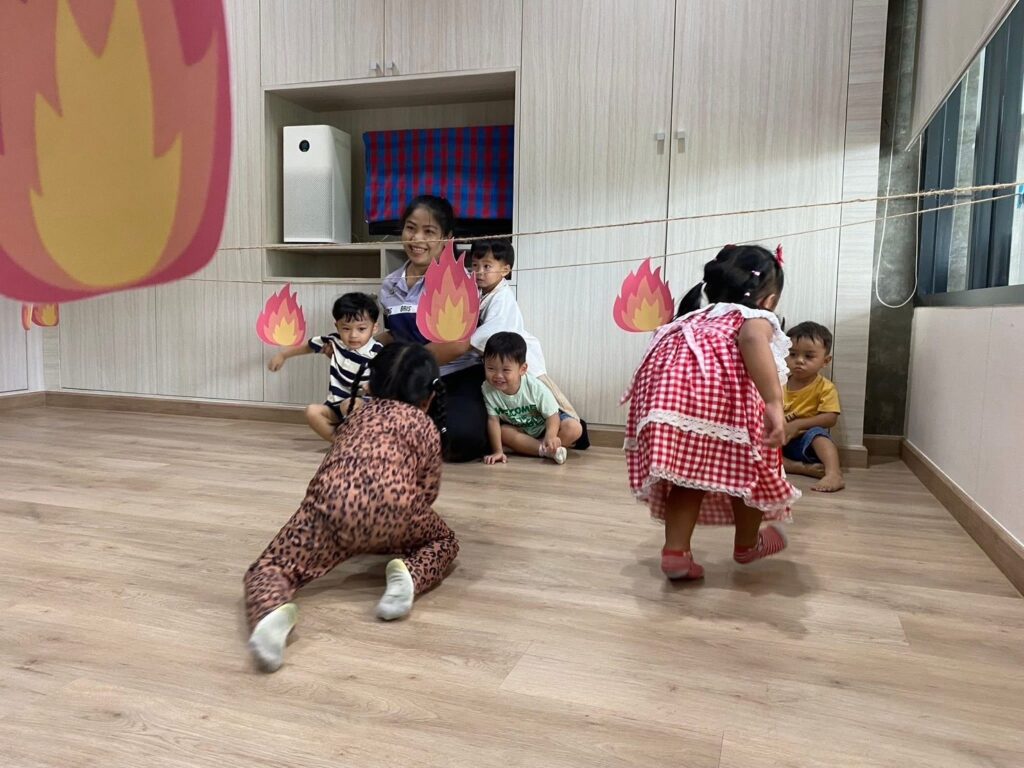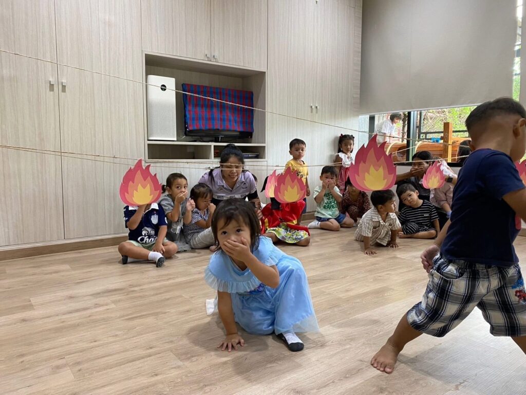• Children develop observation and movement skills through pointing to pictures, handling props, or imitating fire escape actions.