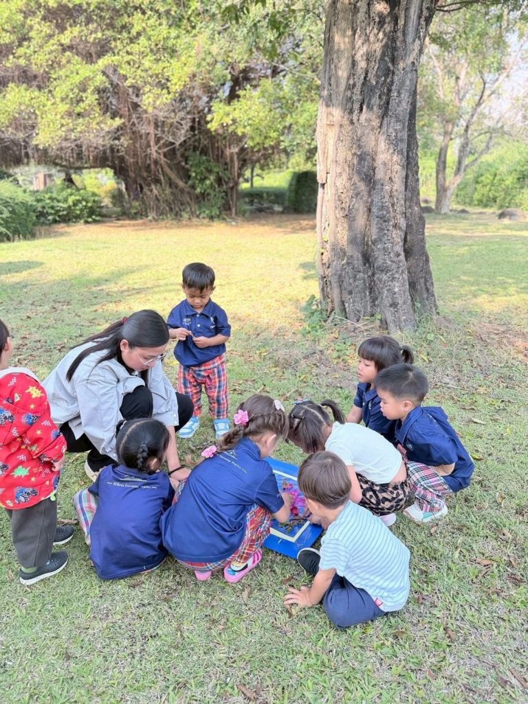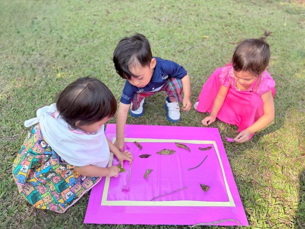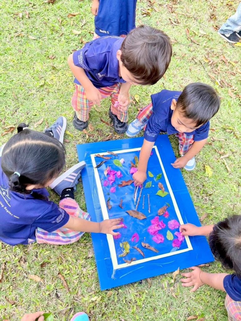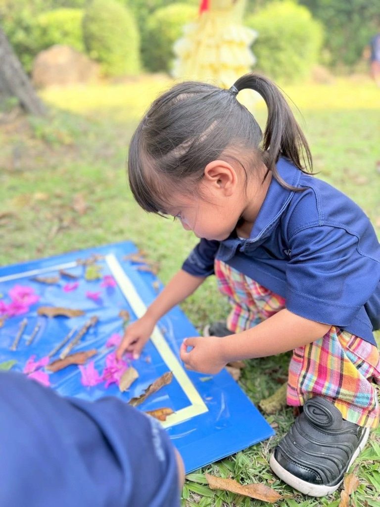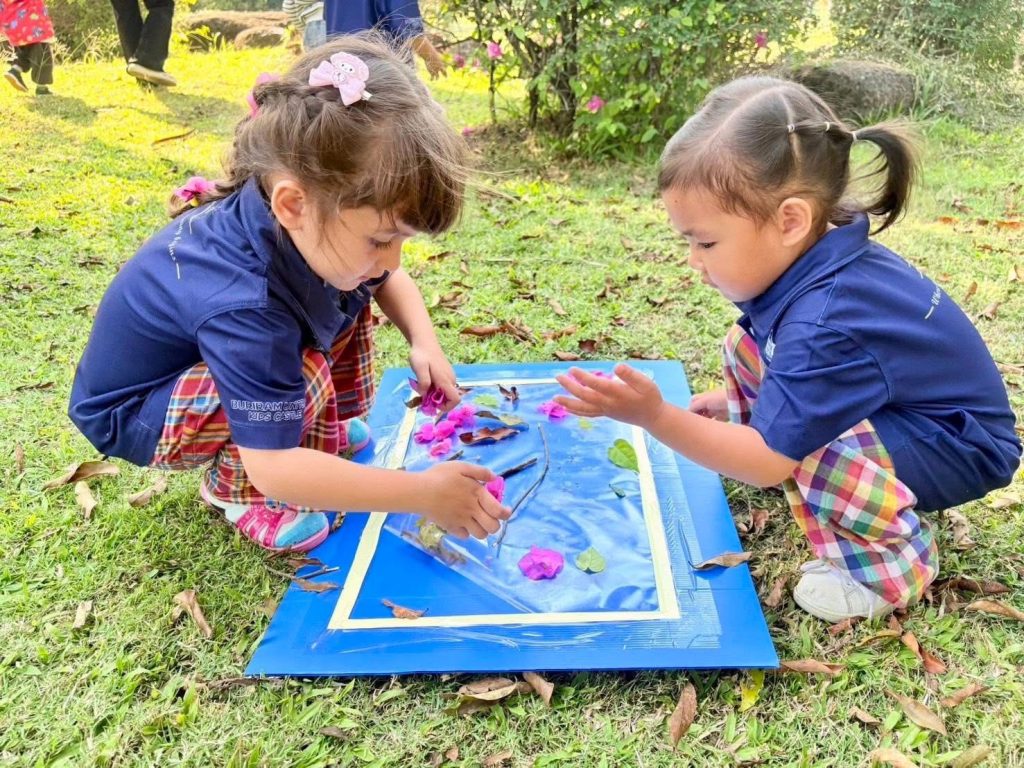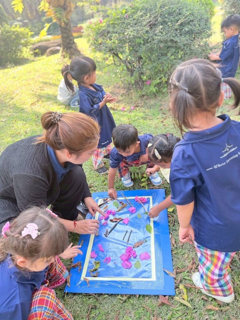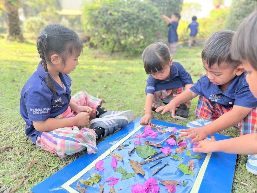เด็กๆ ร่วมกันนำวัสดุธรรมชาติ เช่น ดอกไม้ ใบไม้ และกิ่งไม้ มาจัดวางบนแผ่นรองเพื่อสร้างสรรค์งานศิลปะกลางแจ้ง เป็นการเรียนรู้ผ่านการสัมผัสและการสำรวจสิ่งแวดล้อมรอบตัวอย่างอิสระ