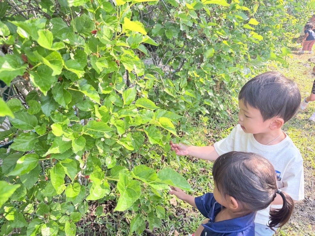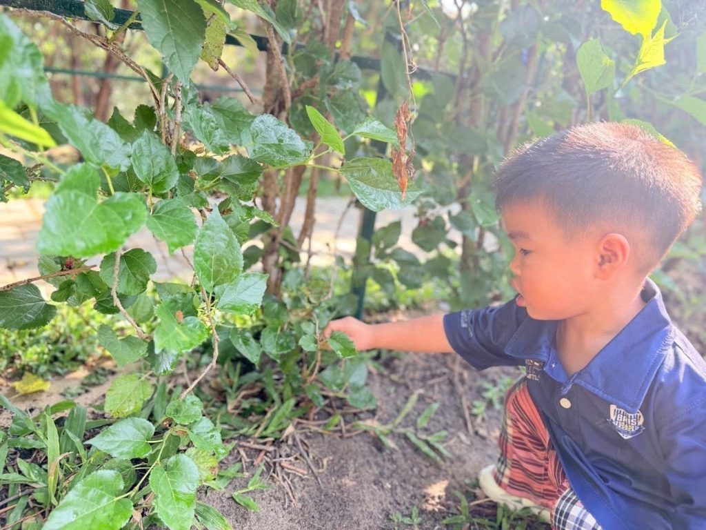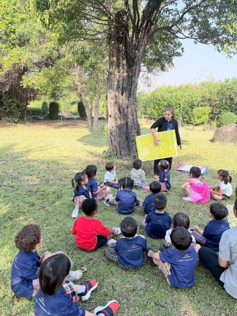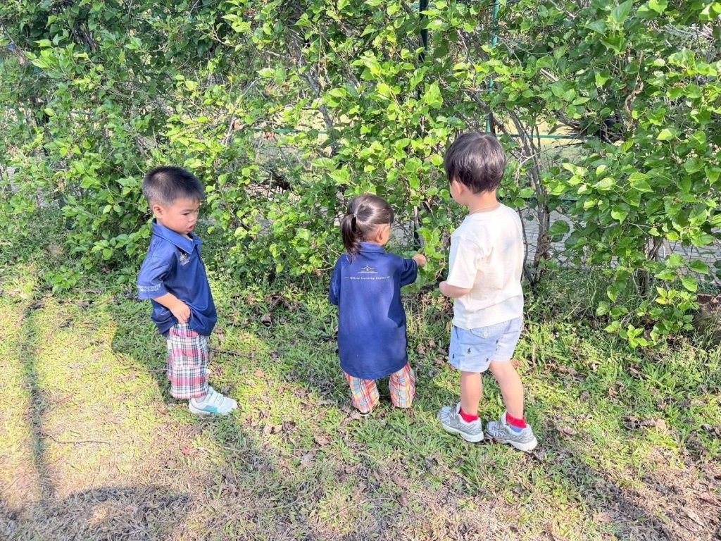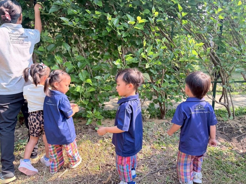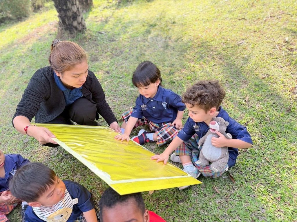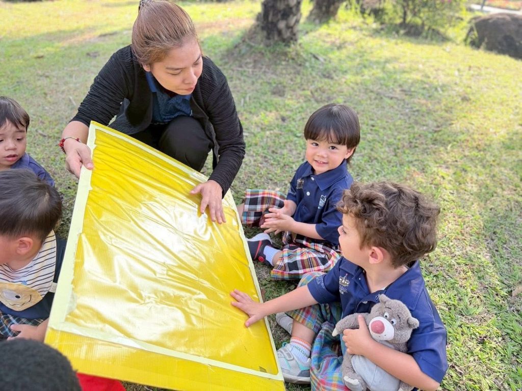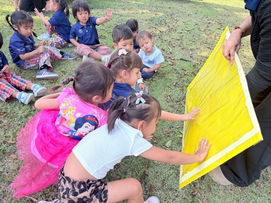 เด็กๆ ร่วมกันนำวัสดุธรรมชาติ เช่น ดอกไม้ ใบไม้ และกิ่งไม้ มาจัดวางบนแผ่นรองเพื่อสร้างสรรค์งานศิลปะกลางแจ้ง เป็นการเรียนรู้ผ่านการสัมผัสและการสำรวจสิ่งแวดล้อมรอบตัวอย่างอิสระ