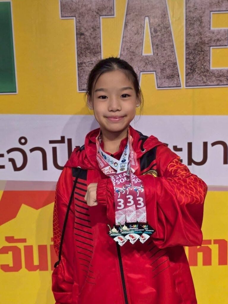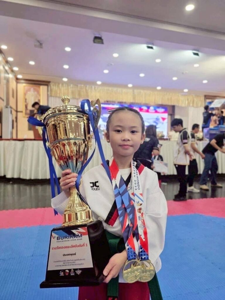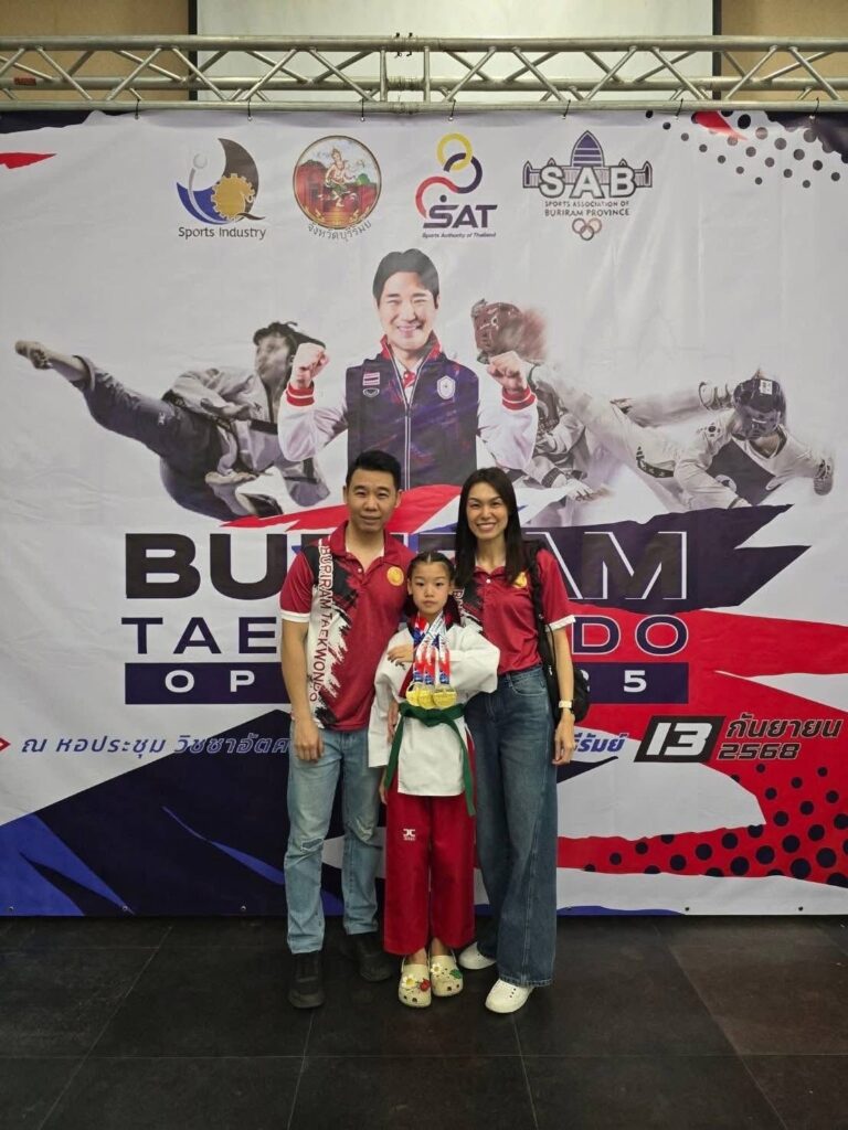 โรงเรียนบุรีรัมย์อินเตอร์สคูล ขอแสดงความยินดีกับน้องเหมยเม่ย เด็กหญิงนภัสนันทร์ เหลืองชัยศรี 🎉 คุณพ่อและคุณแม่ของน้อง ในโอกาสที่คว้ารางวัลความสามารถทางกีฬา จากการแข่งขัน BURIRAM TAEKWONDO OPEN CHAMPIONSHIP 2025 จัดขึ้นเมื่อวันที่ 13 กันยายน 2568 ณ หอประชุมวิชชาอัตศาสตร์ มหาวิทยาลัยราชภัฏบุรีรัมย์ รางวัลที่ได้รับ 🥇 เหรียญทอง พุมเซ่เดี่ยว สายเหลือง รุ่นอายุ 9-10 ปี หญิง 🥇 เหรียญทอง พุมเซ่เดี่ยว สายเขียว รุ่นอายุ 9-10 ปี หญิง 🥇 เหรียญทอง พุมเซ่กลุ่ม สายเขียว รุ่นอายุ 11-12 ปี หญิง 🏆 ถ้วยรางวัลคะแนนรวมพุมเซ่อันดับ 2 ขอชื่นชมในความมุ่งมั่น ทุ่มเท
